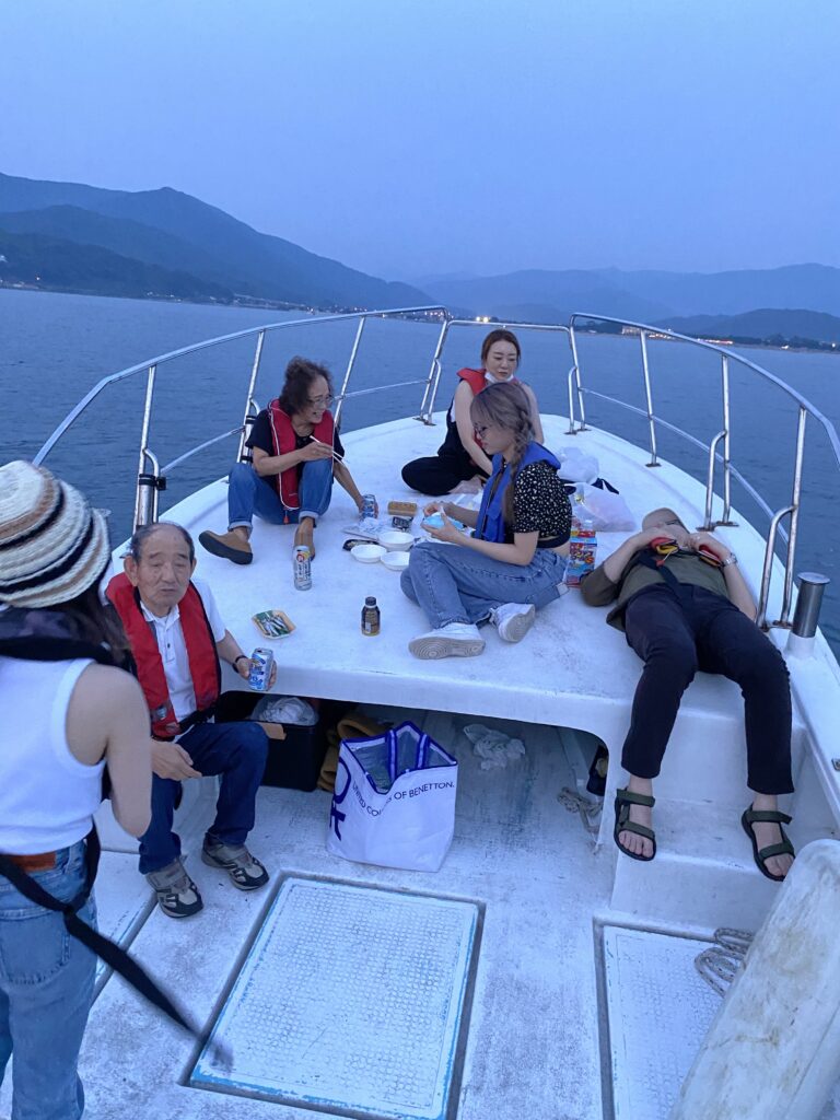 夕日を見ながら船で食べるご飯は最高😃